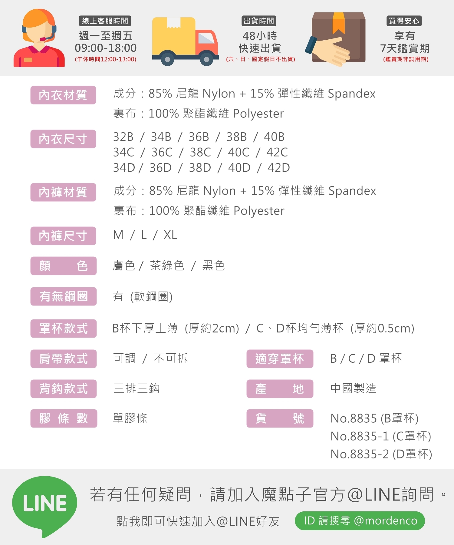• 商品貨號:8835 (B罩杯) / 8835-1 (C罩杯) / 8835-2 (D罩杯)